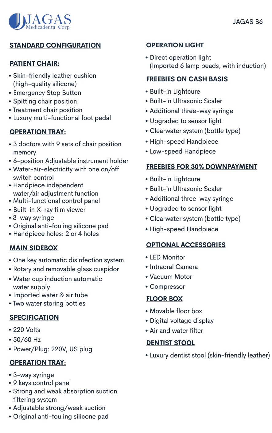 The Jagas B6 is a premium dental chair engineered for optimal patient comfort and clinical efficiency. It features a skin-friendly silicone leather cushion, an emergency stop button, and programmable chair positions, including spitting and treatment modes. The operation tray offers a multifunctional control panel, built-in X-ray film viewer, and a 3-way syringe. Additional amenities include a rotary glass cuspidor, automatic disinfection system, and an adjustable LED operation light, making the B6 an excellent choice for modern dental practices.