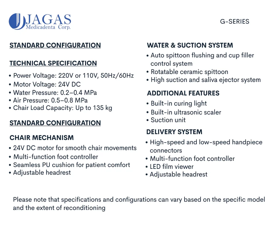 The G-Series — China Reconditioned Dental Chair offers a balance of affordability and functionality, making it an ideal choice for dental practices seeking cost-effective solutions. This reconditioned chair features essential components such as a comfortable patient seat, adjustable headrest, and integrated delivery system to facilitate various dental procedures. Its compact design ensures efficient use of operatory space, while the durable construction provides reliable performance. The G-Series chair is a practical option for clinics aiming to maintain quality care within budget constraints.