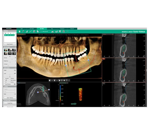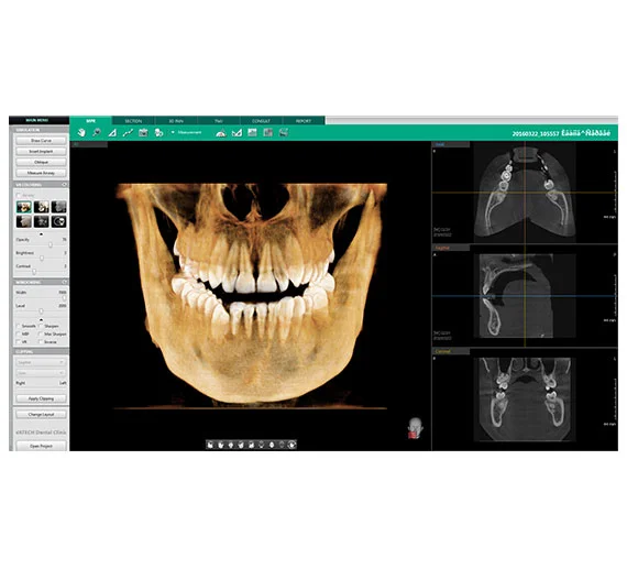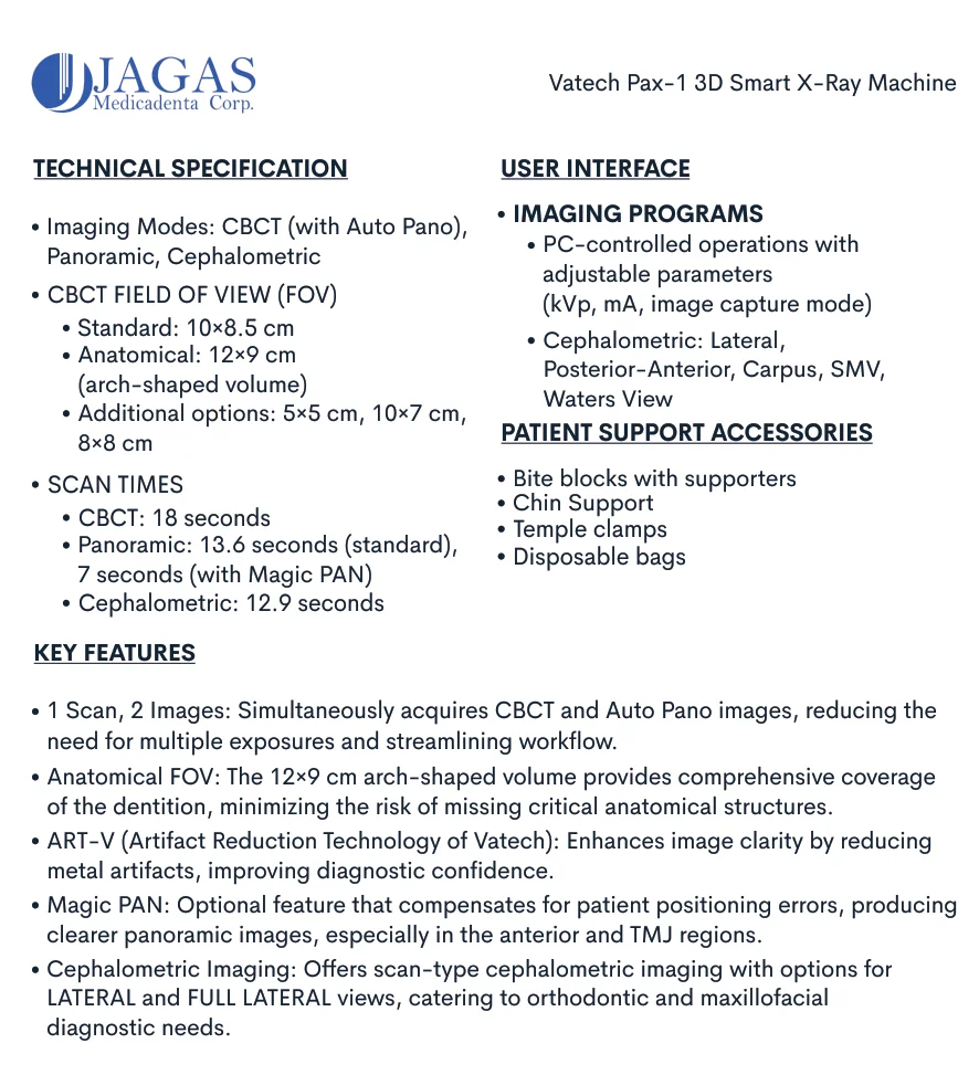 The Vatech PaX-i3D Smart X-Ray Machine is an advanced 3-in-1 dental imaging system that integrates CBCT, panoramic, and cephalometric functionalities. Its innovative “1 Scan, 2 Images” feature captures both CT and Auto Pano images simultaneously, enhancing diagnostic efficiency. The anatomical 12×9 cm field of view provides comprehensive coverage, including challenging areas like impacted third molars. Equipped with ART-V technology, it effectively reduces metal artifacts for clearer images. With a 0.5 mm focal spot and up to 14-bit grayscale depth, it delivers high-resolution images while minimizing radiation exposure.